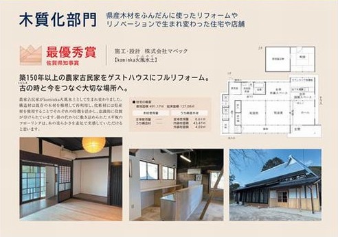「森川海人っフェス!」にて、「第8回さがの木の住まいコンクール」最優秀賞の表彰式がありました 2023.12.14 佐賀県より、 「第8回さがの木の住まいコンクール」において、当社が 木質化部門 佐賀県知事賞(最優秀賞)を受賞 し、令和 5 年 11 月 19 日(日)に開催された「森川海人っフェス!」にて、表彰されました。