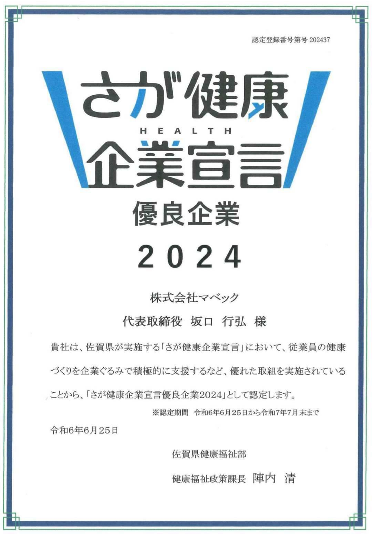 『さが健康企業宣言』優良企業2024に認定されました 2024.07.19 この度、佐賀県が実施する『さが健康企業宣言』において、『さが健康企業宣言 優良企業2024』に認定されました。 株式会社マベックではこれからも、従業員の健康づくりを企業ぐるみで継続的に支援し、従業員の健康を守るために積極的な取組を行っていきます。
