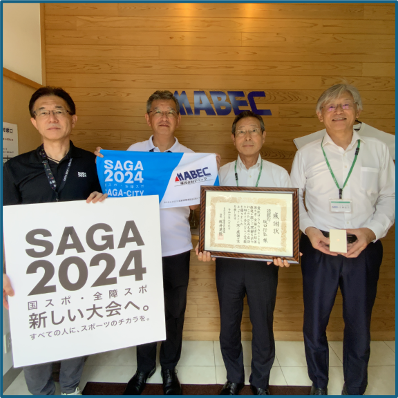 SAGA2024佐賀市実行委員会より感謝状を頂きました。 (SAGA2024佐賀市への協賛) 2024.08.26 SAGA2024佐賀市実行委員会より、感謝状及び記念品を頂きました。 (*2024年8月9日、本社にて感謝状贈呈式が行われました。) SAGA2024が成功するように今後もバックアップをさせていただきます。 【感謝状贈呈式】(8月9日(金)株式会社マベック本社にて) 【協賛物品】(フェイスタオル400枚)