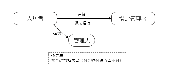 - 退去日の10日前までに、まず、電話などで指定管理者各管理事務所に連絡してください。退去手続きの説明をします。それから、「退去届」を提出してください。