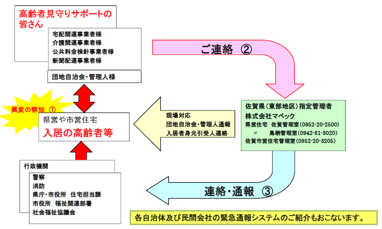 県営・市営住宅を訪問した際やご近所の方に①~③のような異変が認められた場合、各管理室まで通報していただくことにしております。